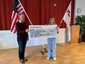 Ordf Calle Nilsson överlämnar check till Saga